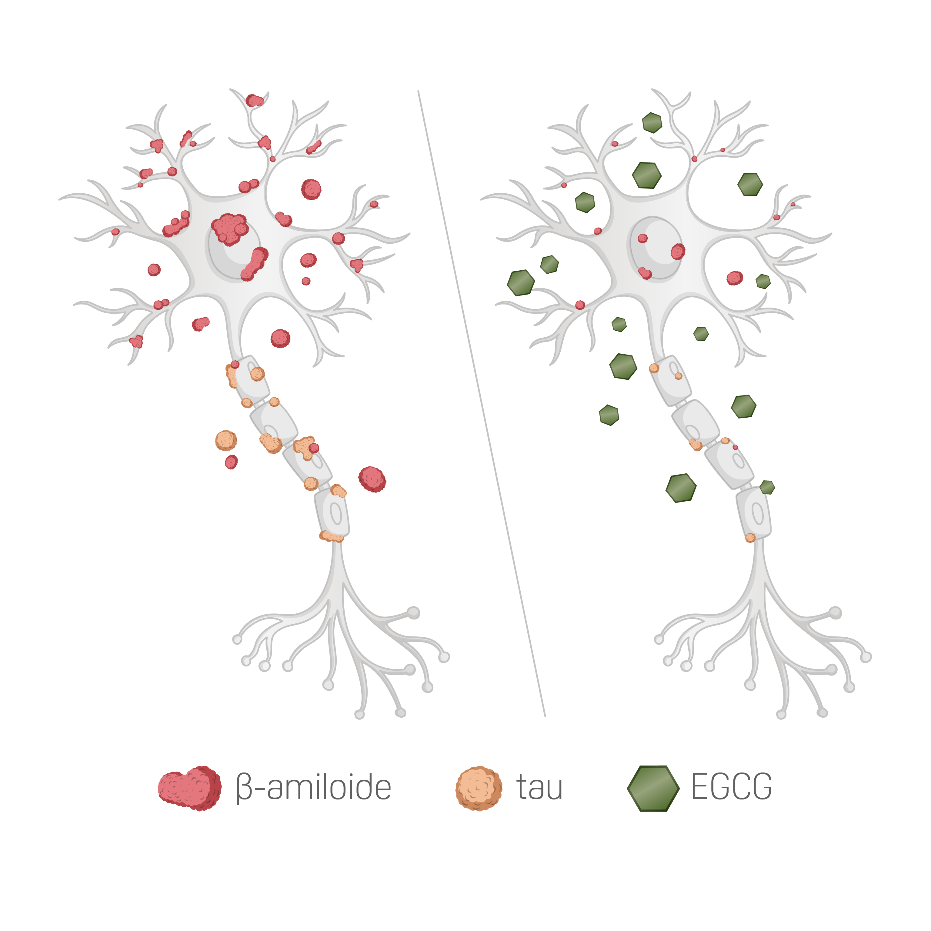 En modelos preclínicos, la EGCG favorece rutas que disminuyen la acumulación de β-amiloide y tau, ambas implicadas en el Alzheimer.